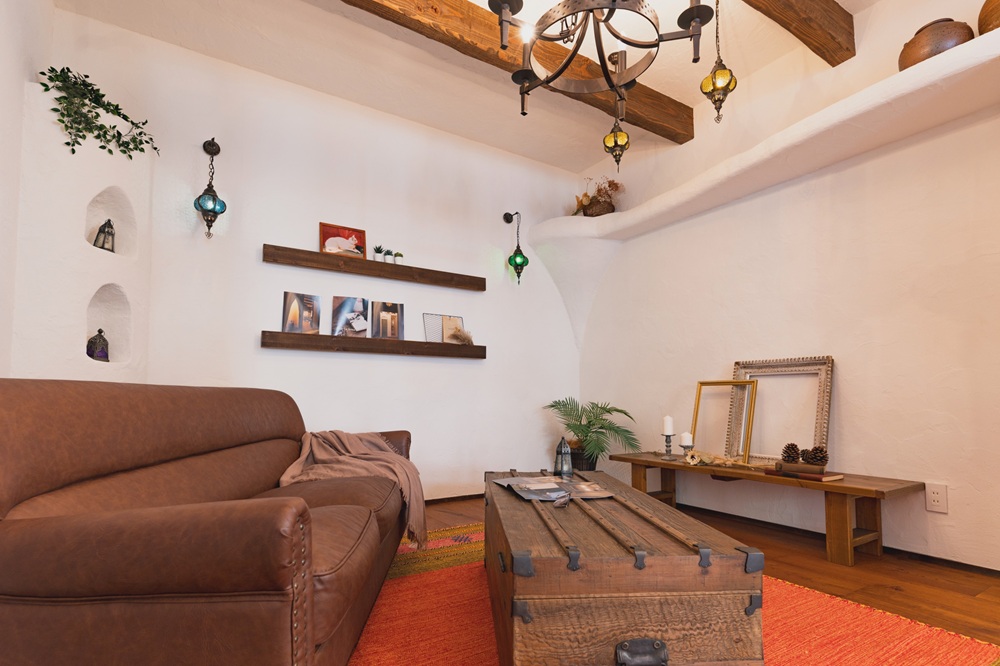 漆喰塗りの壁やエイジング加工を施した木材など、素朴で温かみのある素材が特徴です。