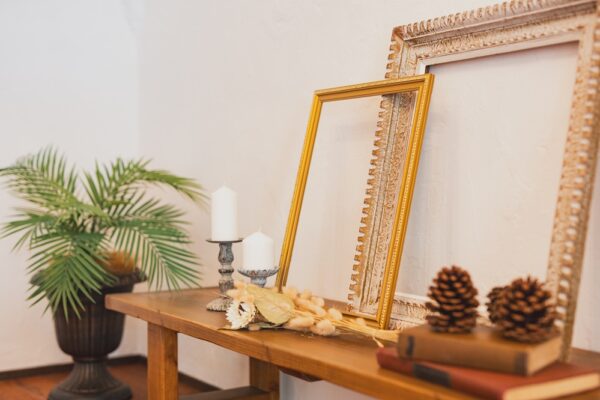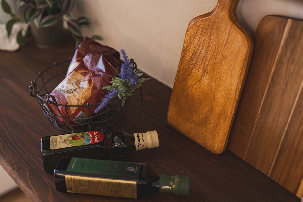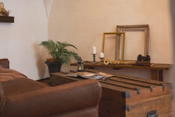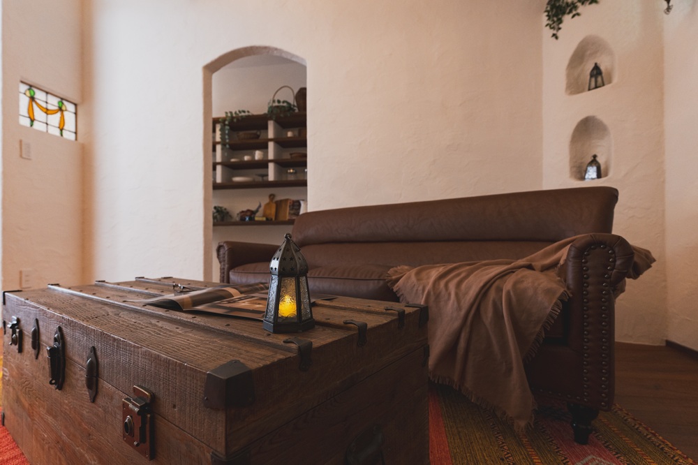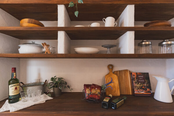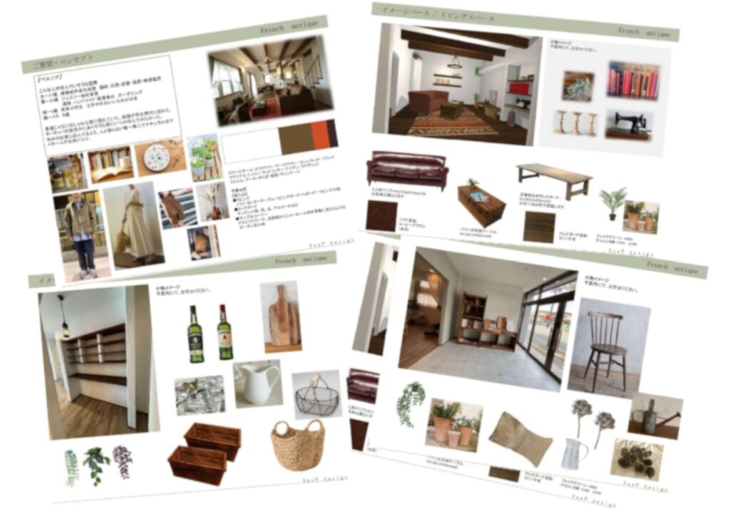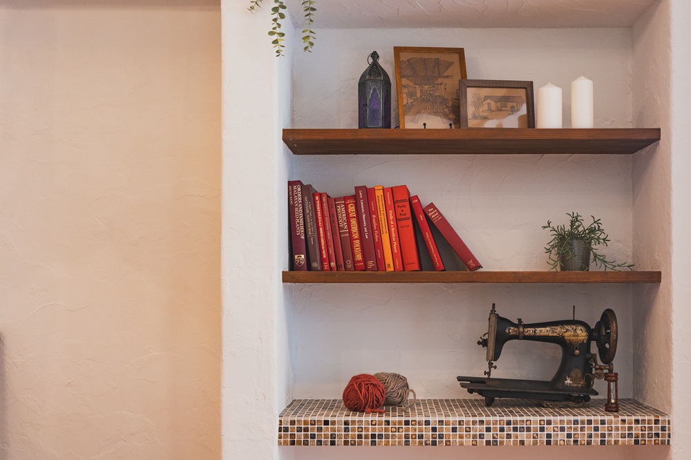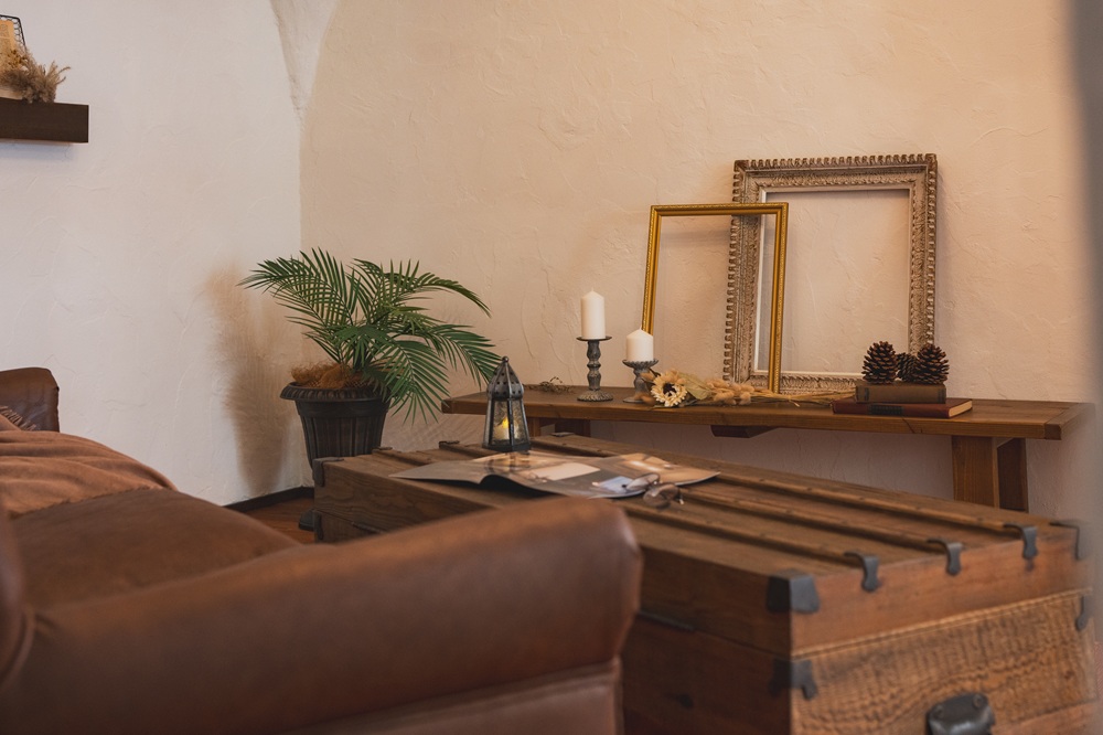 この色を軸に全体をコーディネートし、空間に温かさと個性をプラスしました。家具は古材やヴィンテージ加工を施したものを選び、内装のアンティーク感と調和させています。小物はきっちり並べすぎず、あえてラフに雑然と置くことで、ラフェルムらしい素朴さを演出しました。