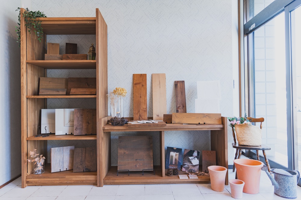 その魅力を引き立てるのは、アンティークの家具や使い込んだ風合いのある小物たち。まさに「暮らしの物語がはじまる場所」にふさわしいショールームです。