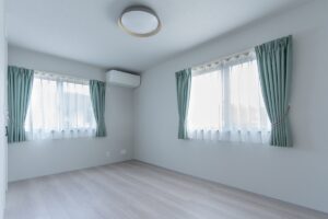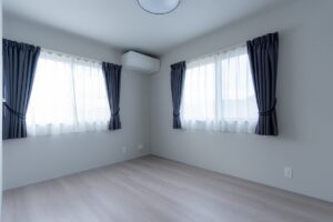 2階の寝室エリアはライトグレイッシュな木質フローリングでほっと安らぐ柔らかな空間とし、カーテンはご家族3人のそれぞれのお好きなお色を選び、個性のある個室となっています。